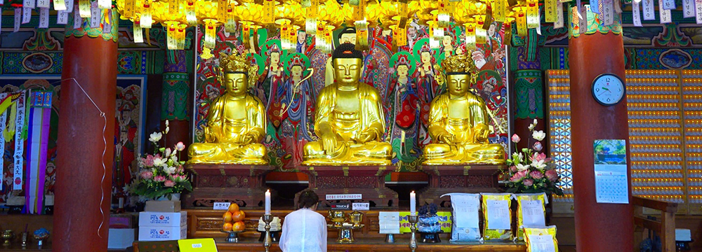 - 법당 출입 시, 정중앙에 위치한 어간문은 조실 스님과 주지 스님이 사용하시는 문이므로, 일반 신도와 스님들은 좌우 측면의 문을 이용해야 합니다. 또한 법당 문을 열고 닫을 때 소리가 나지 않도록 주의하고, 신발은 가지런히 정리하여 벗어 둡니다.