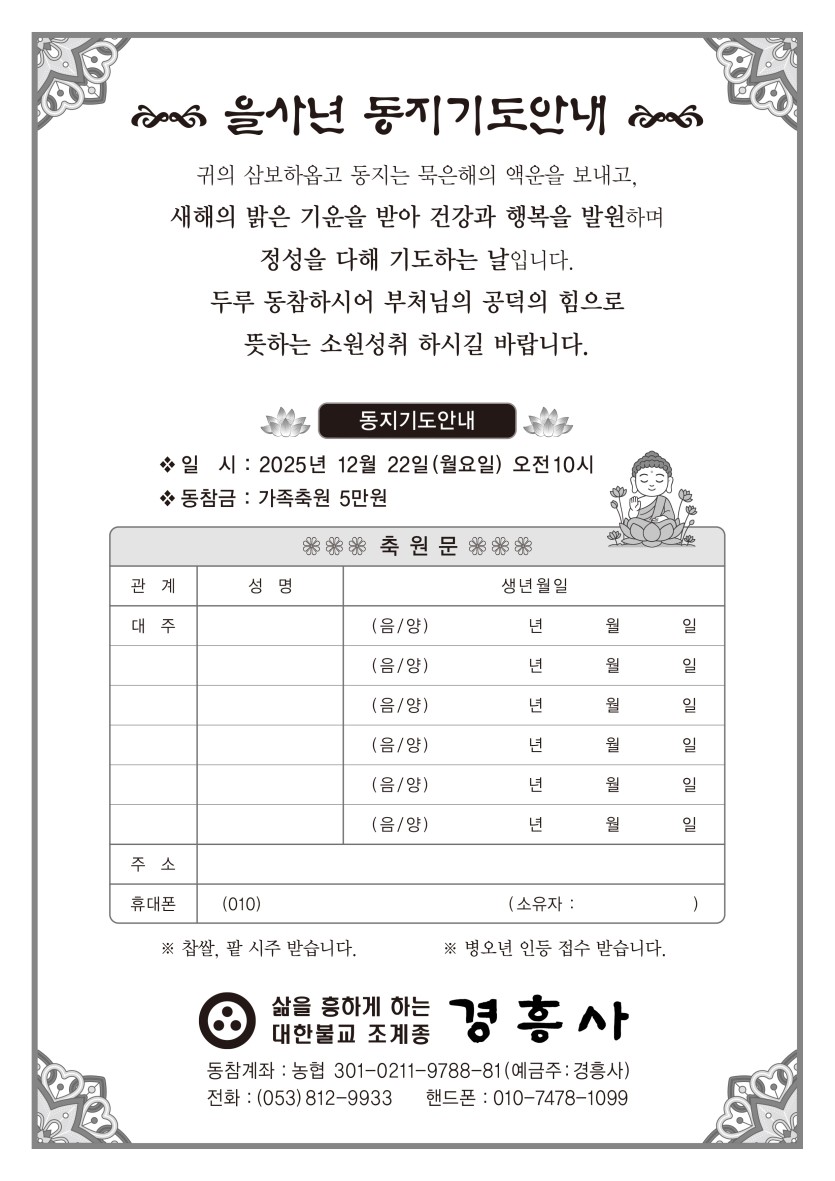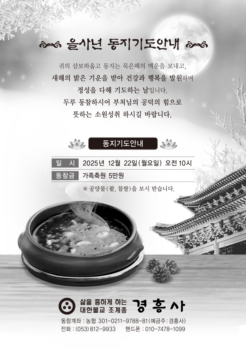 우리절 경흥사에서는 동지를 맞아 기도안내하오니 두루 동참하시어 부처님의 공덕의 힘으로 뜻하는 소원성취 하시길 바랍니다.